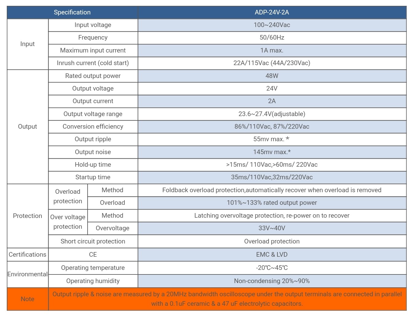 | ADP 24V-2A | Input voltage:100~240Vac,Output voltage:24V,Rated output power :48W, | Specifikacije