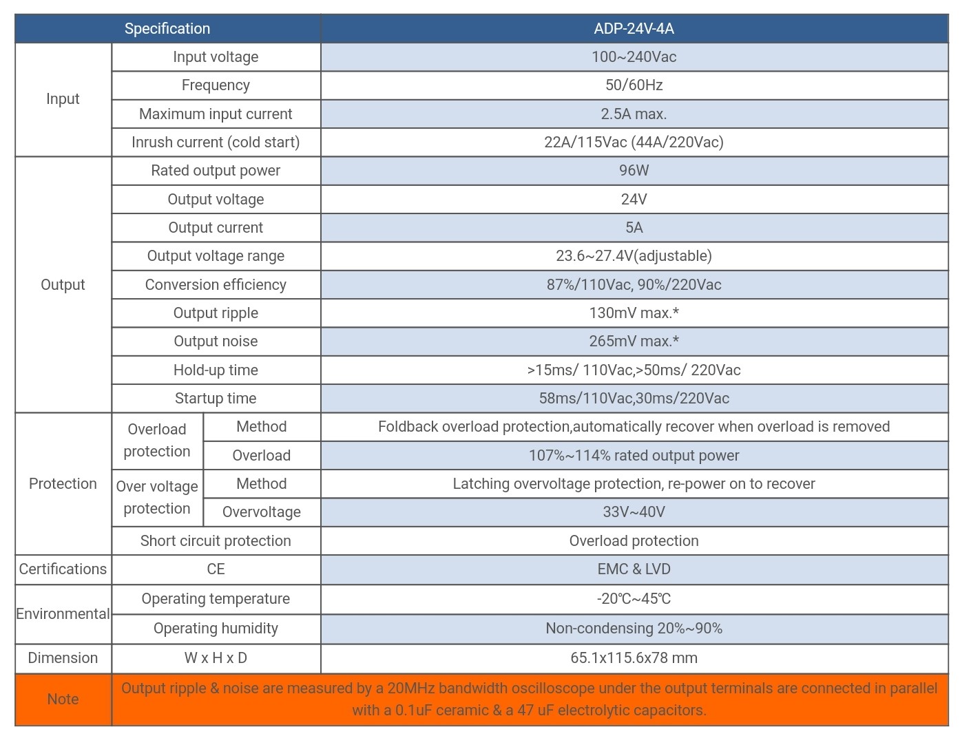 | ADP 24V-4A | Input voltage:100~240Vac, Output voltage:24V, Rated output power :96W, | Specifikacije