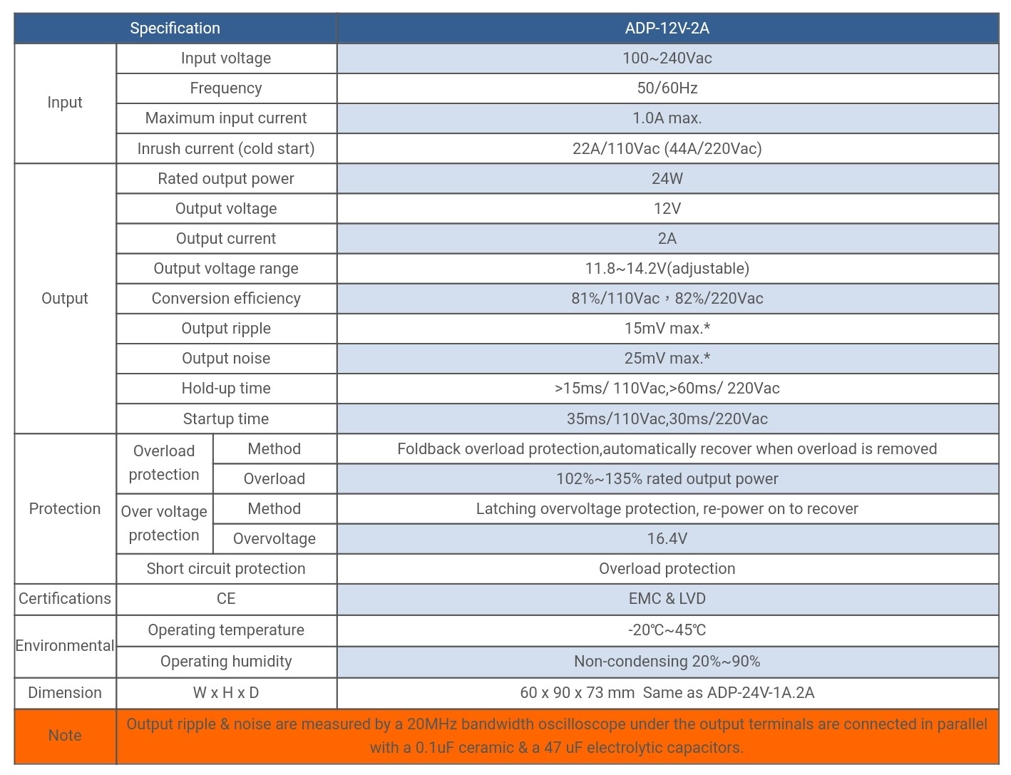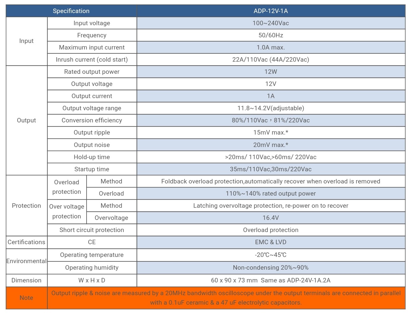 | ADP-12V-1A | Input voltage:100~240Vac,Output voltage:12V,Rated output power :12W, | Specifikacije