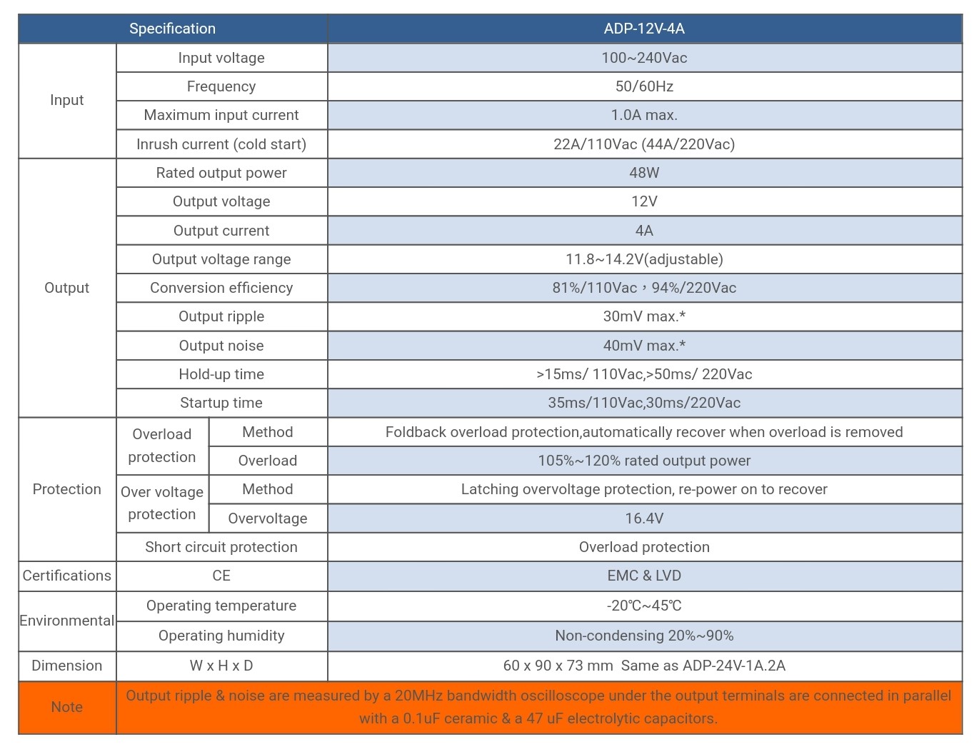 | ADP-12V-4A | Input voltage:100~240Vac, Output voltage:12V, Rated output power :48W, | Specifikacije