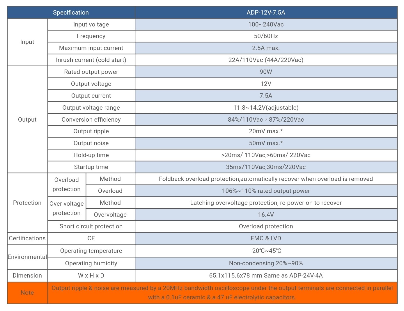 | ADP-12V-7.5A | Input voltage:100~240Vac, Output voltage:12V, Rated output power :90W, | Specifikacije