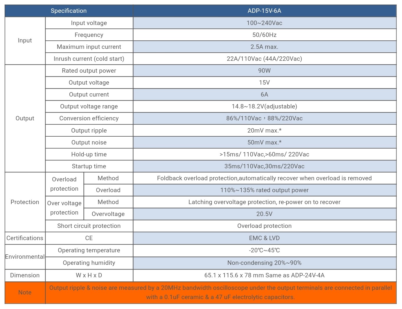 | ADP-15V-6A | Input voltage:100~240Vac, Output voltage:15V, Rated output power :90W, | Specifikacije